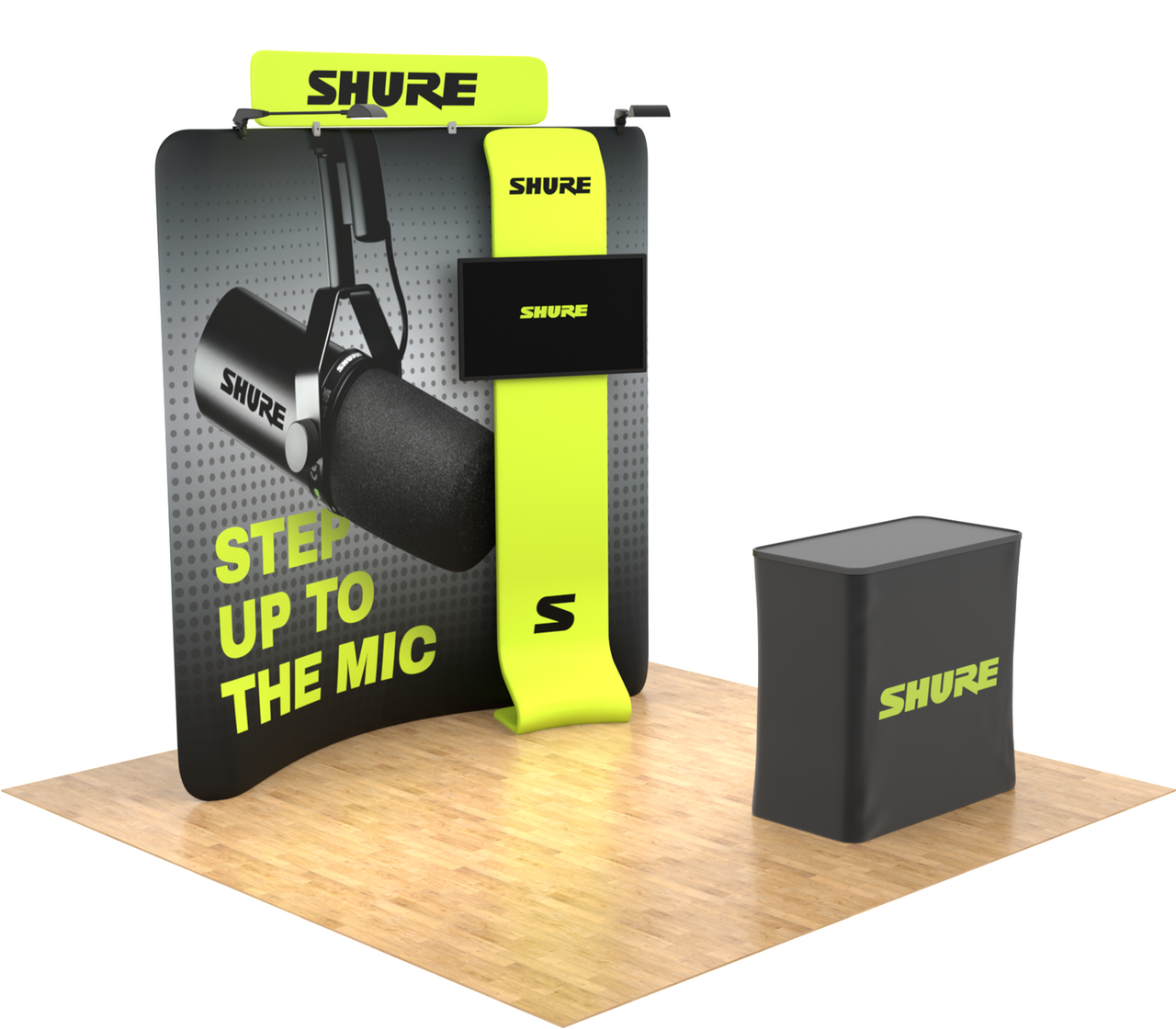 You’ve asked and we’ve listened. By popular demand, are pleased to now offer the 8ft version of our best-selling trade show display, the QuickZip™ MAX package. The QuickZip (formerly Tru-Fit) 8ft MAX Package Curved is a power-packed portable exhibition kit that is sure to draw your clients in with the premium bells and whistles that balance beauty with functionality. More than a simple marketing backdrop, this package includes a custom-printed TV stand with shelves, as well as a branded header to maximize your visibility on the trade show floor.