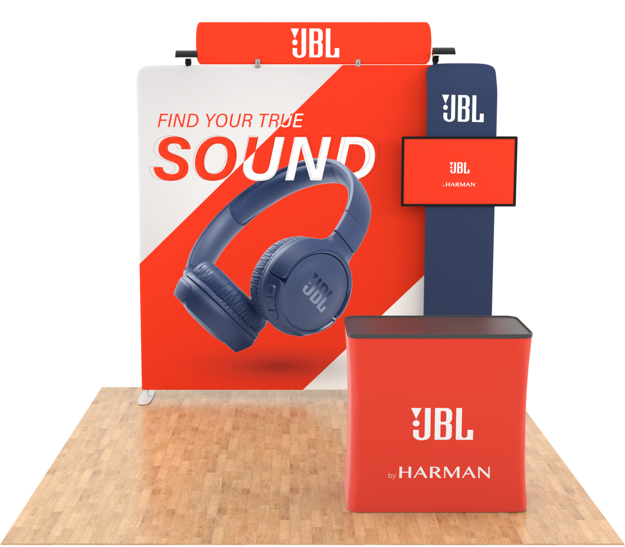 Beauty meets brains in our most stunning and effective portable trade show display line. The 8ft QuickZip™ MAX Straight package maximizes the potential of your trade show booth while minimizing the amount of space it fills. A surefire crowd-pleaser, this display boasts a TV stand with custom printed graphic and two shelves, along with a captivating header attachment that sits flush or raised above the 8ft backdrop.